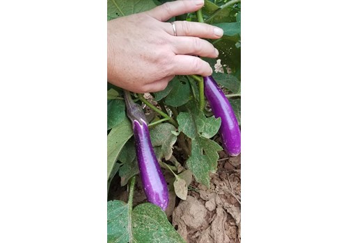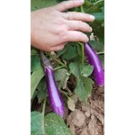 Purple Asian eggplant with low bitterness and thin skin. Grown here at our farm without the use of Plastic mulch, chemicals or CAFO fertilizers.