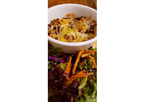 Made with ground beef, tomatoes, kidney beans, cannellini beans, onions, peppers, celery, garlic, chili powder, cumin, oil, s&p.