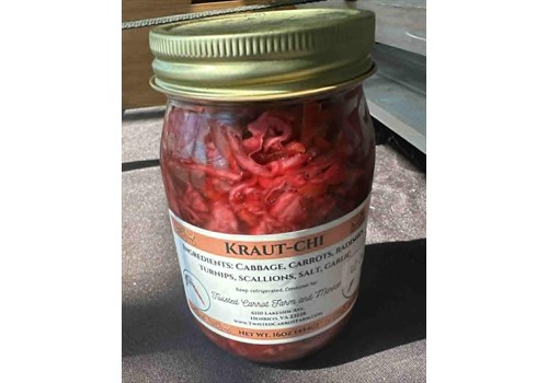Lacto-fermented cabbage with root vegetables and garlic. Full of gut healthy probiotics. NOT spicy. Made with veggies grown on our farm and other local farms.