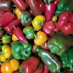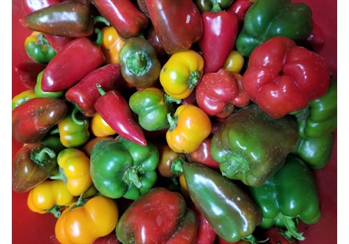 A mix of ripe red & orange Sweet Heirlooms, Corino diTornos. Grown Here at our farm using Organic methods, no CAFO fertilzers and no plastic mulch.