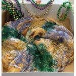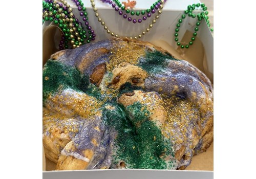 Our cinnamon roll dough turned into the famous king cake! Each cake comes with beads and a baby for you to tuck inside if you choose. Pick from cinnamon, pecan, chocolate or cream cheese