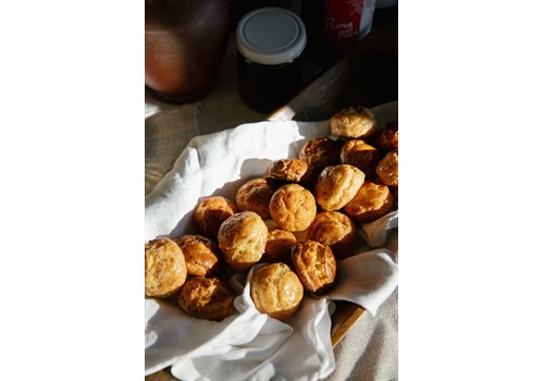 Ingredients: Water, Eggs, Mountain View Farm Cheese (Raw Milk, Cheese Cultures, Propionibacterium 50, Salt, Enzymes), Wade's Mill Unbleached AP Flour, Unsalted Butter, Kosher Salt, Fresh Rosemary, Fresh Thyme, Fresh Chives/Garlic Chives