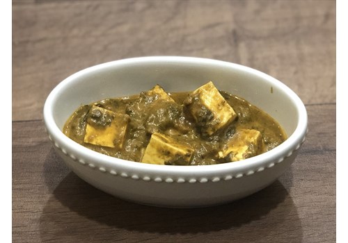 Paneer(Indian compressed cottage cheese) cooked in spinach onion tomato gravy, cream, spices herbs