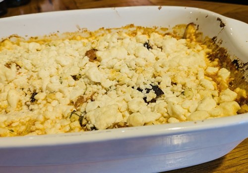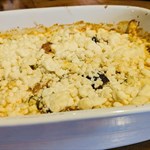 SOLD FROZEN. A flavor-packed entree or side made with tomatoes, eggplants, yellow squash and zucchini, chickpeas, onions garlic, flavored with cinnamon, allspice, oregano, and a dusting of chili flakes and topped with feta, oregano, parsley.