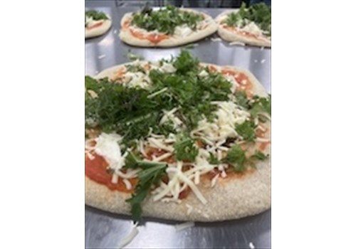 Mixed Asian greens from our farm topped with a balsamic glaze on red tomato sauce with mozzarella/cheddar blend