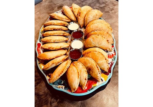 This tray comes with 25 large size empanadas (flavors: Beef, Chicken, RVA, Pork, BF, Quinoa & Veggie) Keep them frozen until ready to bake (pick up one, two or three empanadas to bake at the time and enjoy a delicious snack)