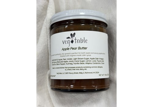 Apples join sweet and Asian pear varieties to be slow simmered into a rich, caramelized spread. Traditional baking spices accentuate the fruits' natural sweetness, rounded out with Virginia-made cider syrup and a hint of vanilla for depth. Fresh thyme is infused during the cooking process, lending an herbaceous brightness on the finish. Incredible on hearty bread with quality butter, on pancakes, or even on-top of pork chops for a sweet-savory moment. Shelf-stable.